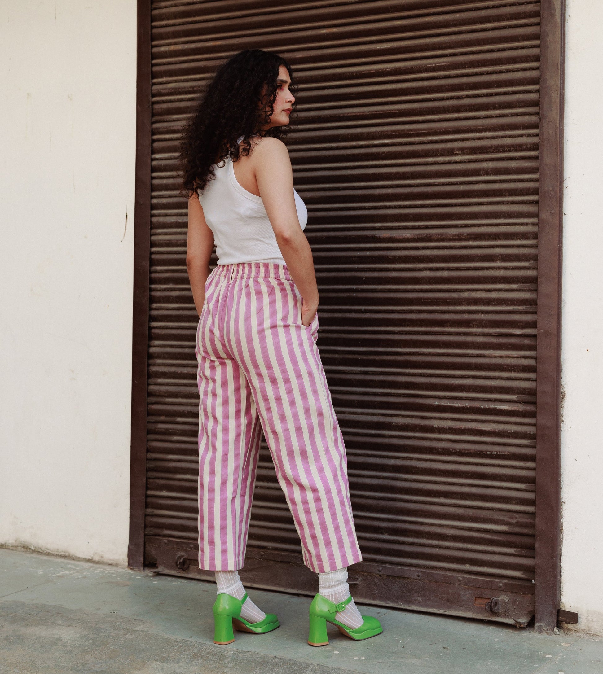 Women’s mid waisted pants made from hand block printed cotton twill in fun wide stripe. Pair with your favorite top or shirt.