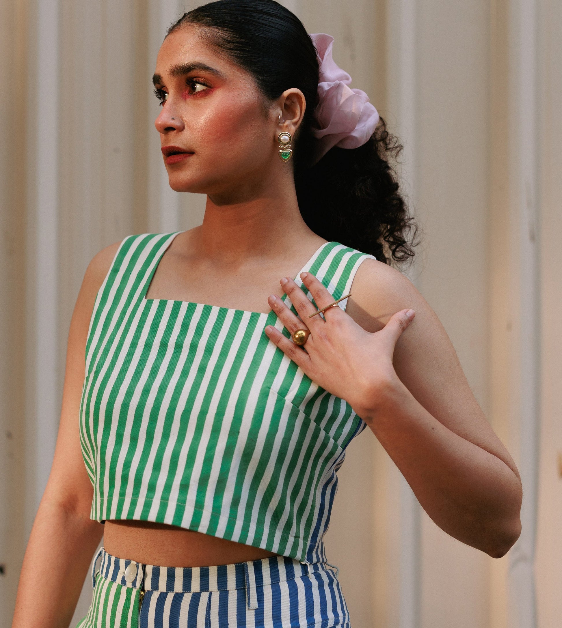 Women’s sleeveless crop top made from hand block printed cotton twill fabric. Top has an invisible zipper on the side for easy wear. This can be worn with a matching pair of pants to create a coordinated look or be worn as separates.Â