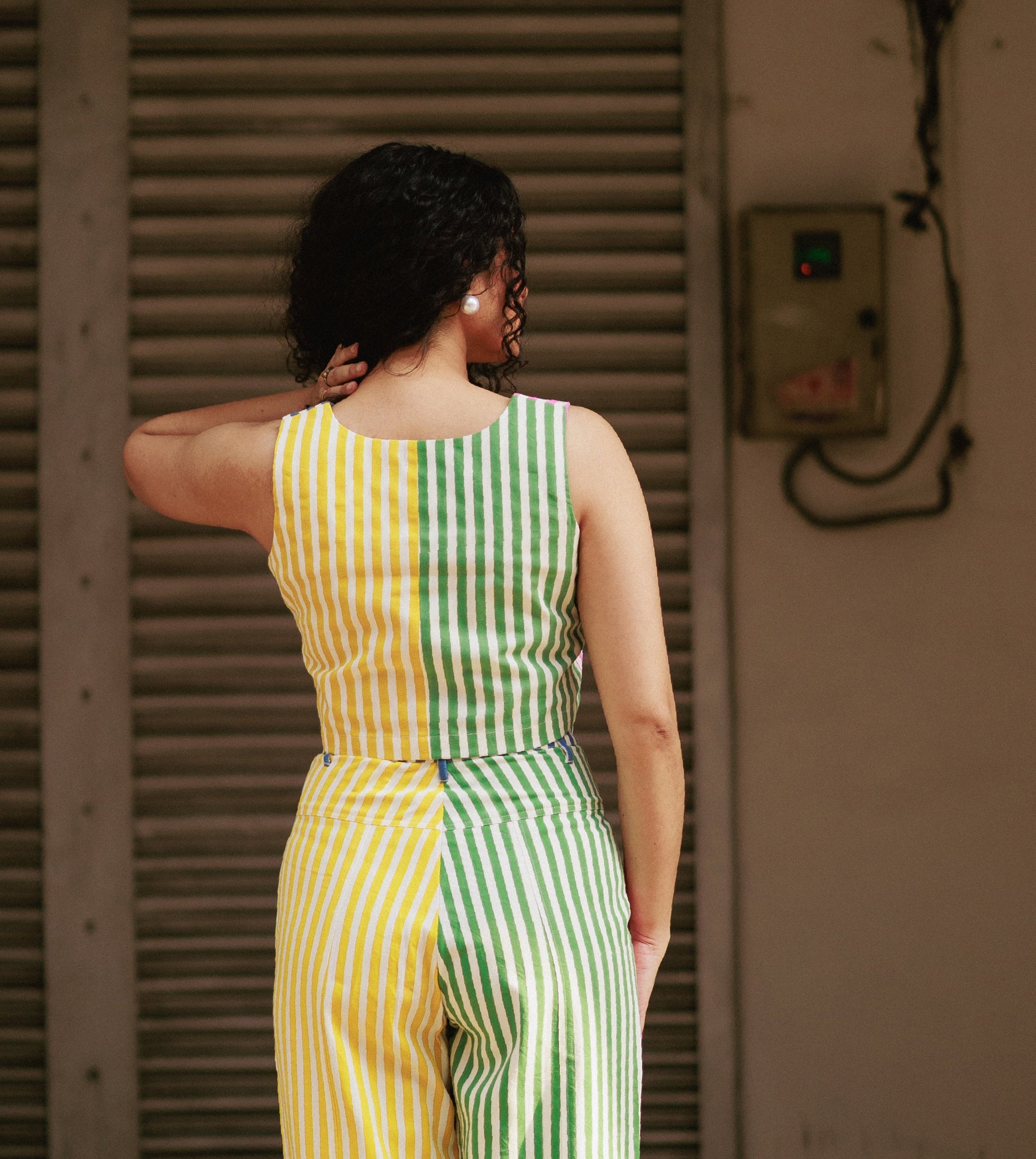 Women’s sleeveless crop top made from hand block printed cotton twill fabric. Top has an invisible zipper on the side for easy wear. This can be worn with a matching pair of pants to create a coordinated look or be worn as separates.