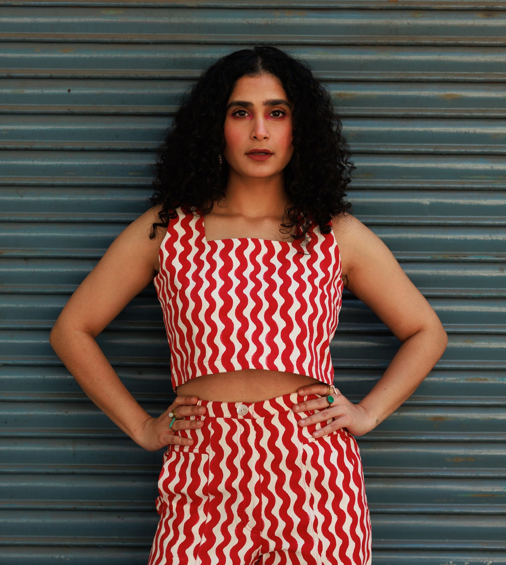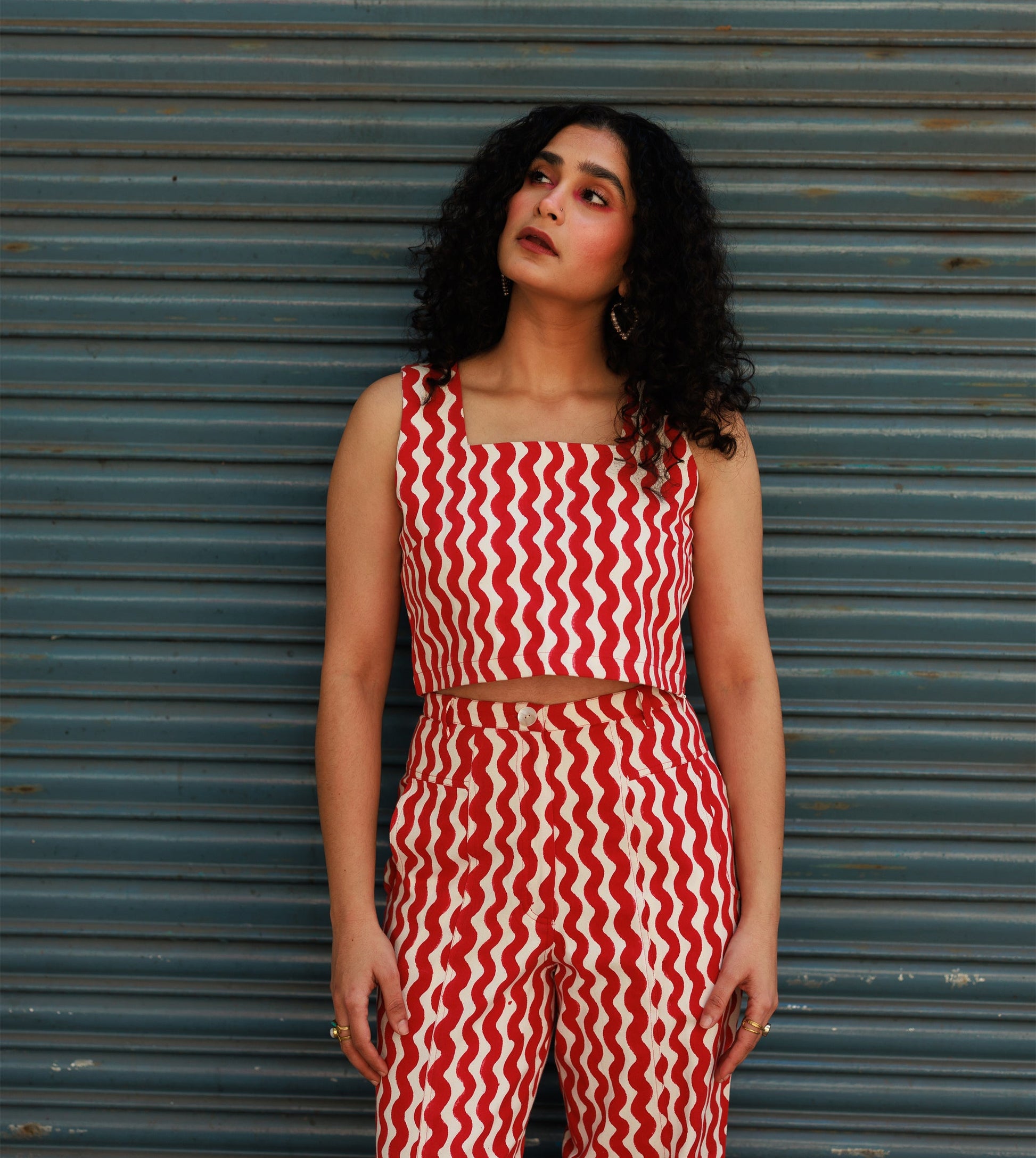 Women’s sleeveless crop top made from hand block printed cotton twill fabric. Top has an invisible zipper on the side for easy wear. This can be worn with a matching pair of pants to create a coordinated look or be worn as separates.