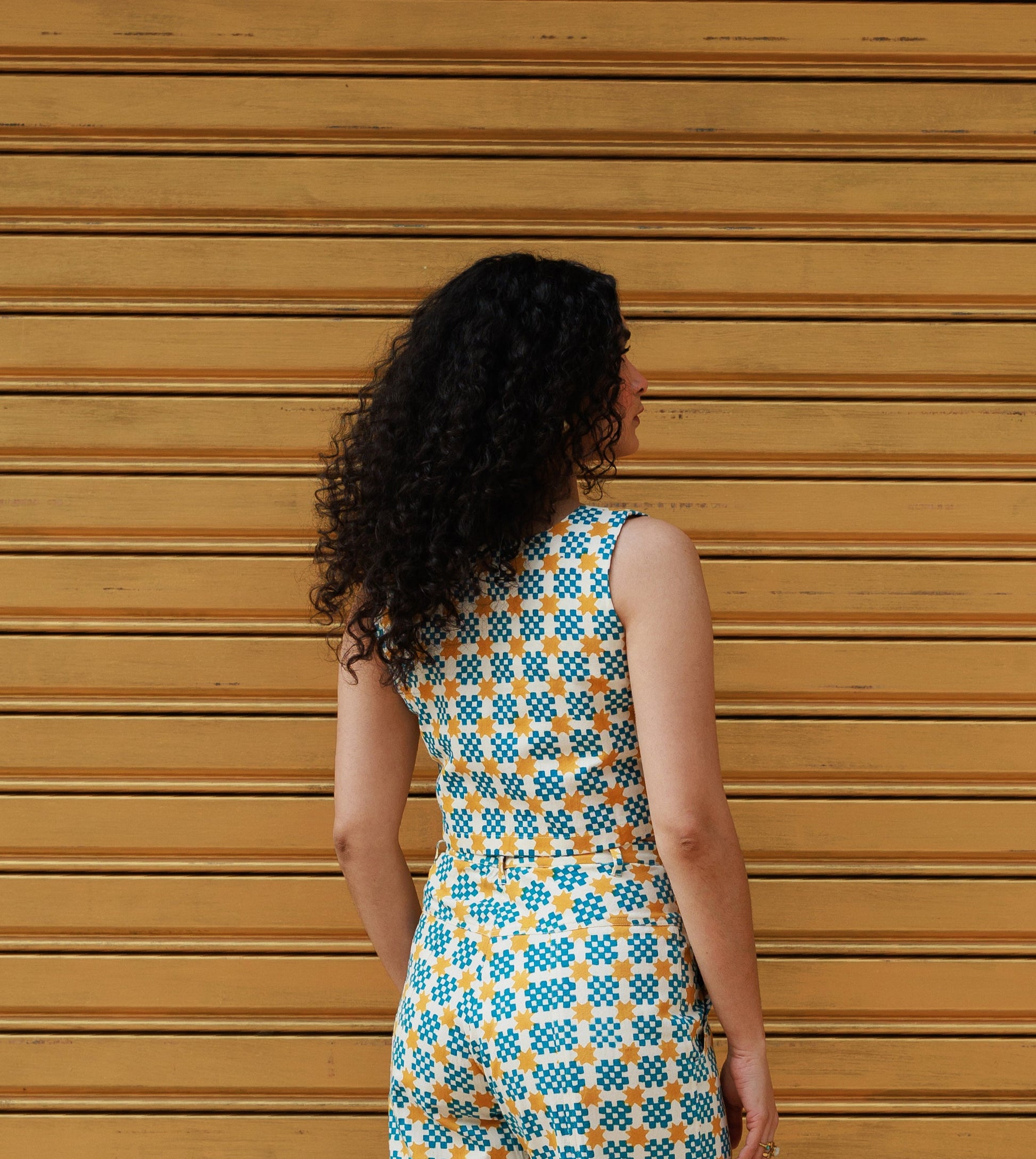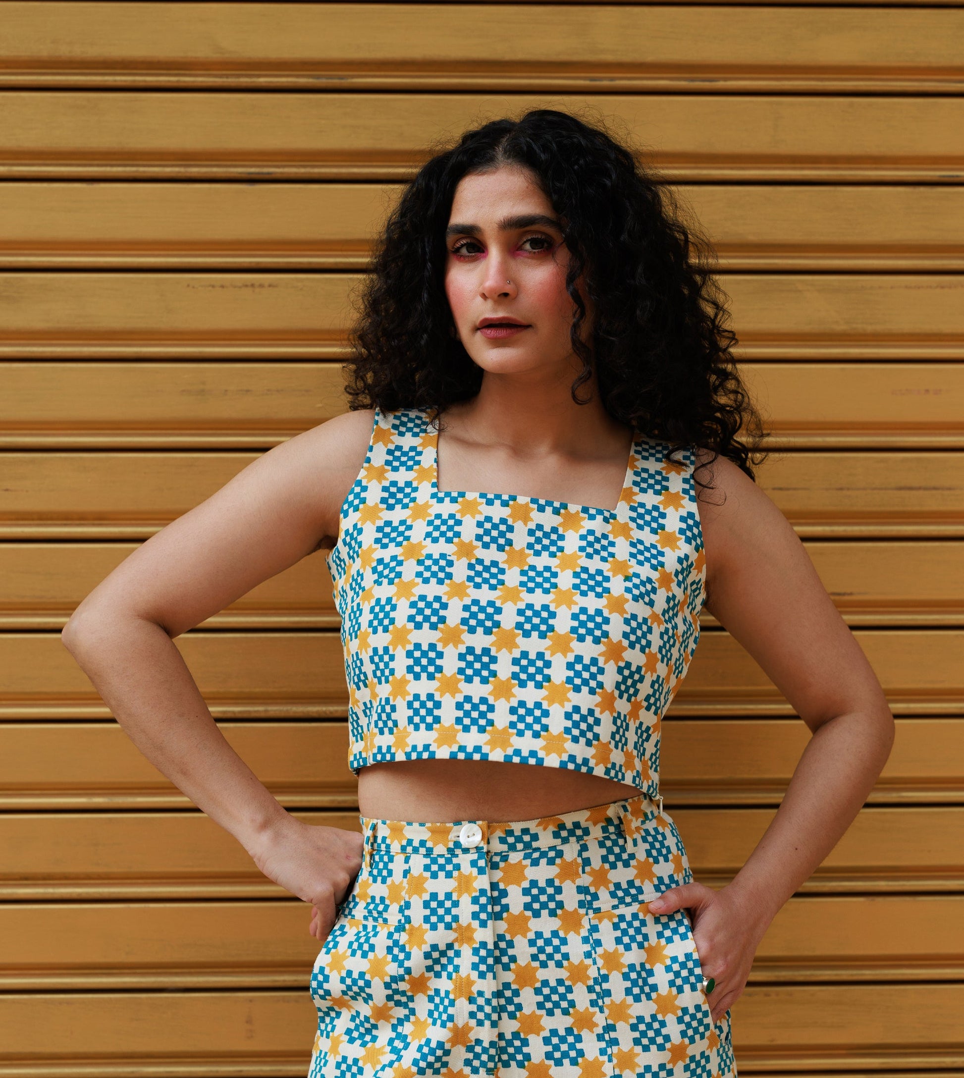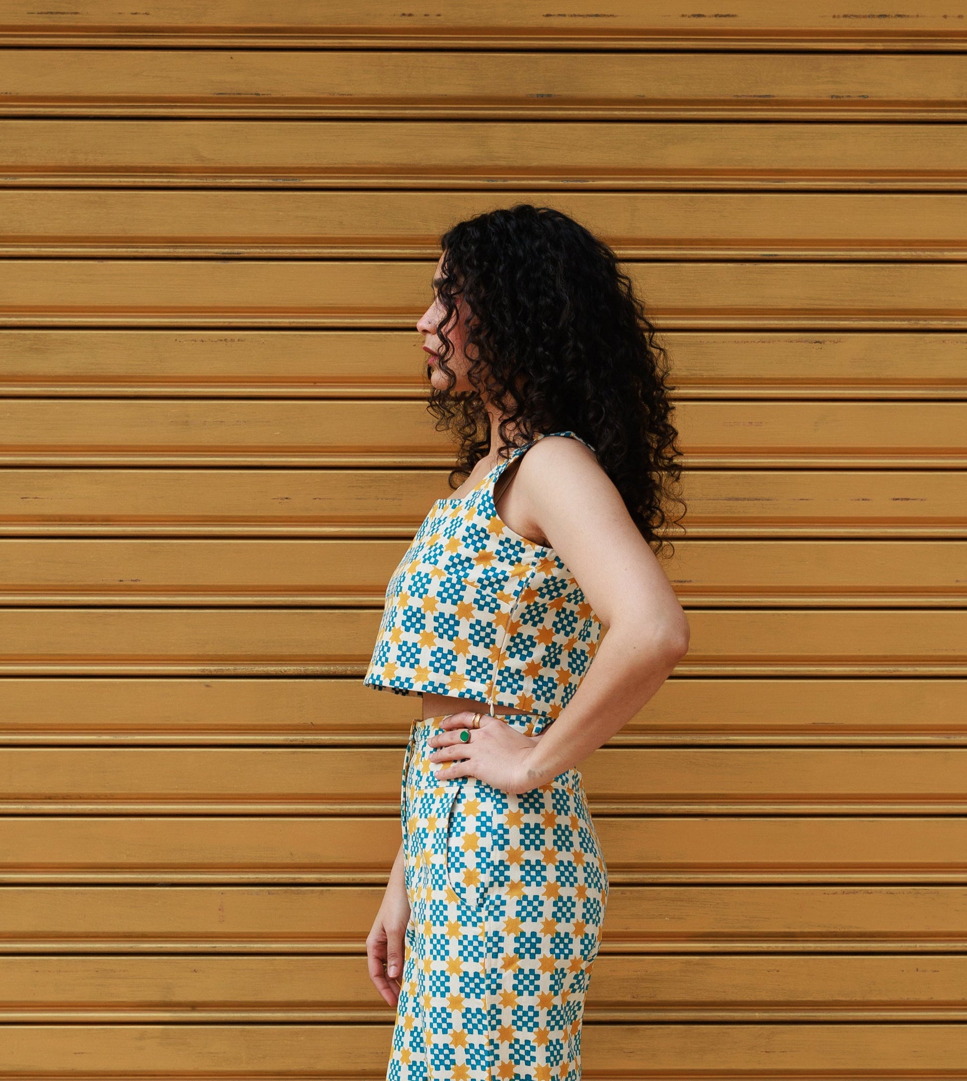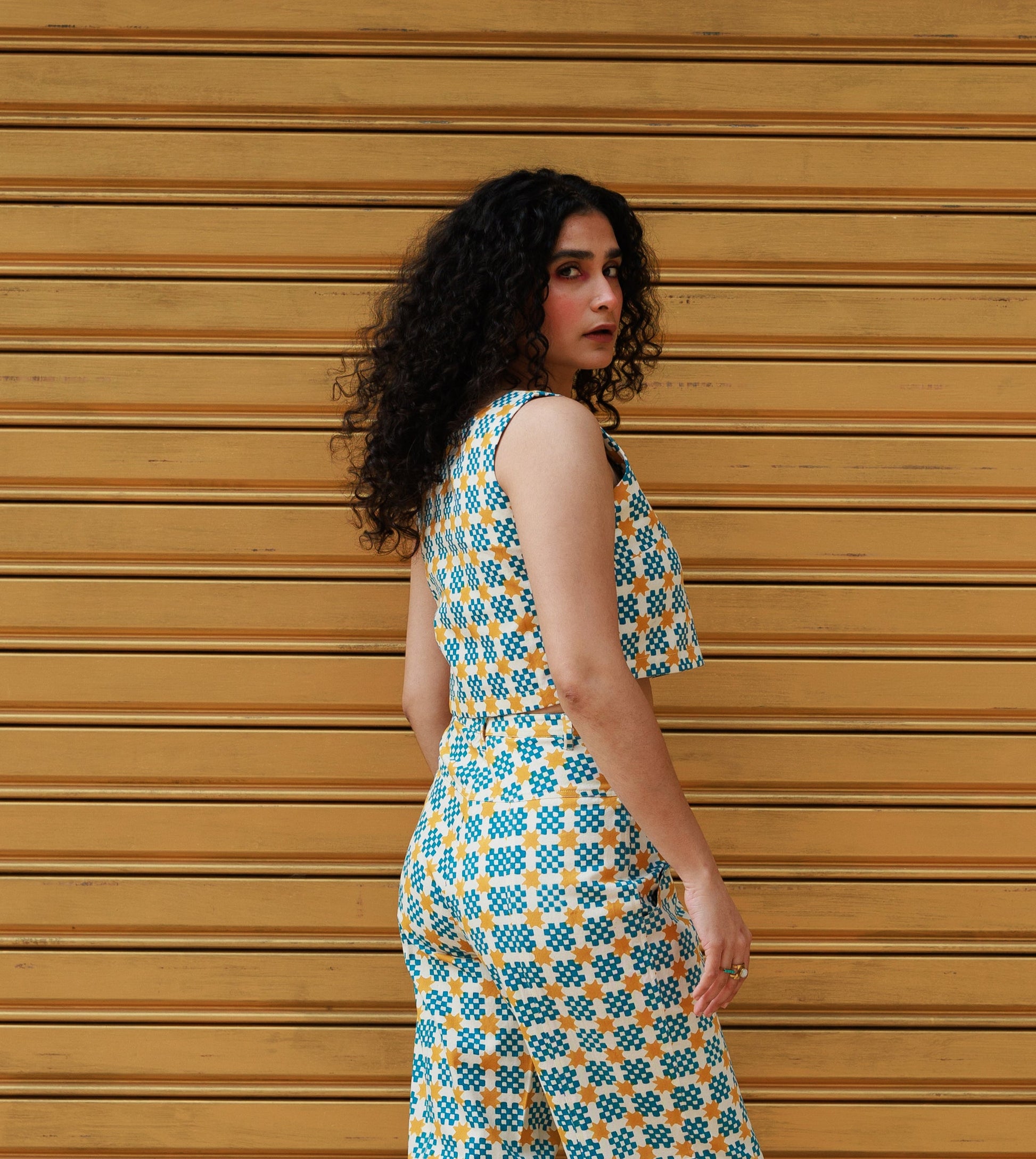 Women’s sleeveless crop top made from hand block printed cotton twill fabric. Top has an invisible zipper on the side for easy wear. This can be worn with a matching pair of pants to create a coordinated look or be worn as separates.Â