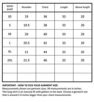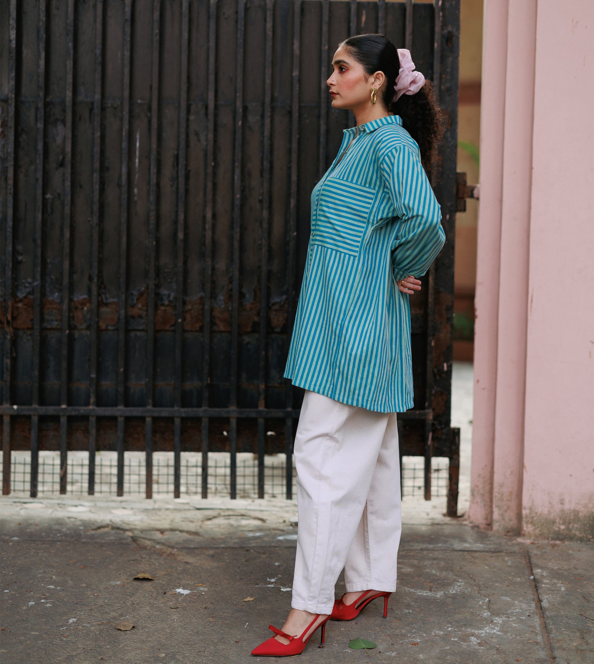 Women's shirt made from hand-woven cotton fabric. This is a long shirt which is meant to be worn untucked. It has gathers on the back panel for added flair.