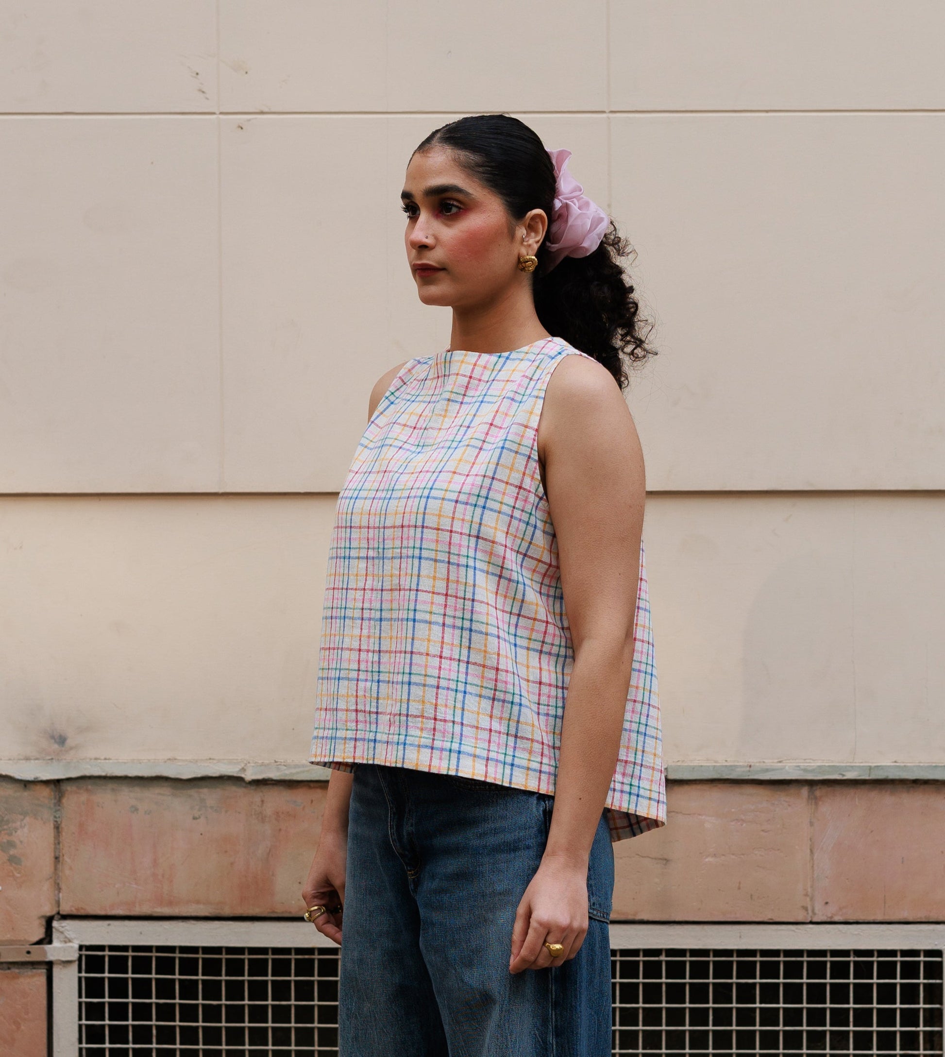 Women’s sleeveless top made from hand woven kala cotton fabric. It has a semi-open back with three buttons.